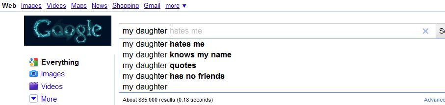 Google Instant for "My Daughter" and it looks like girls are lonely, filled with hate and love to talk.