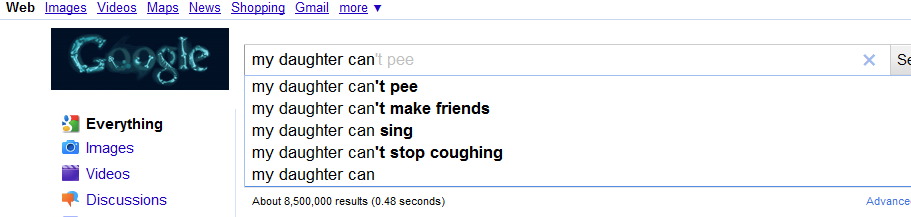 Google Instant for "My daughter can" and look at all the negativity. Daughters can't pee, make friends or stop coughing. Well, at least they can sing.