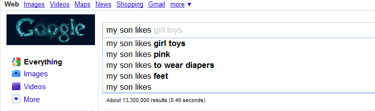 Google Instant for "My son likes" and it looks like there are way too many paranoid parents out there. Girl toys? Pink? Really? And sons also like feet? Guess sons grow up to have foot fetishes.