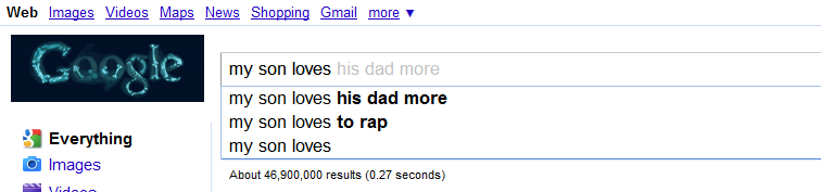 Google Instant for "My son loves" and it seems sons love their dad way more. Sorry moms! And they also love rapping. Who knew!
