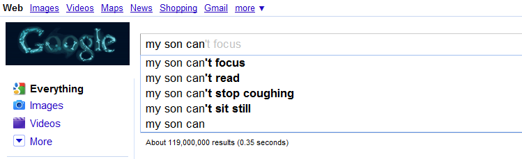 Google Instant for "My son can" and I guess sons are constantly being told what they can't do instead what they can. Looks like sons can't do anything.